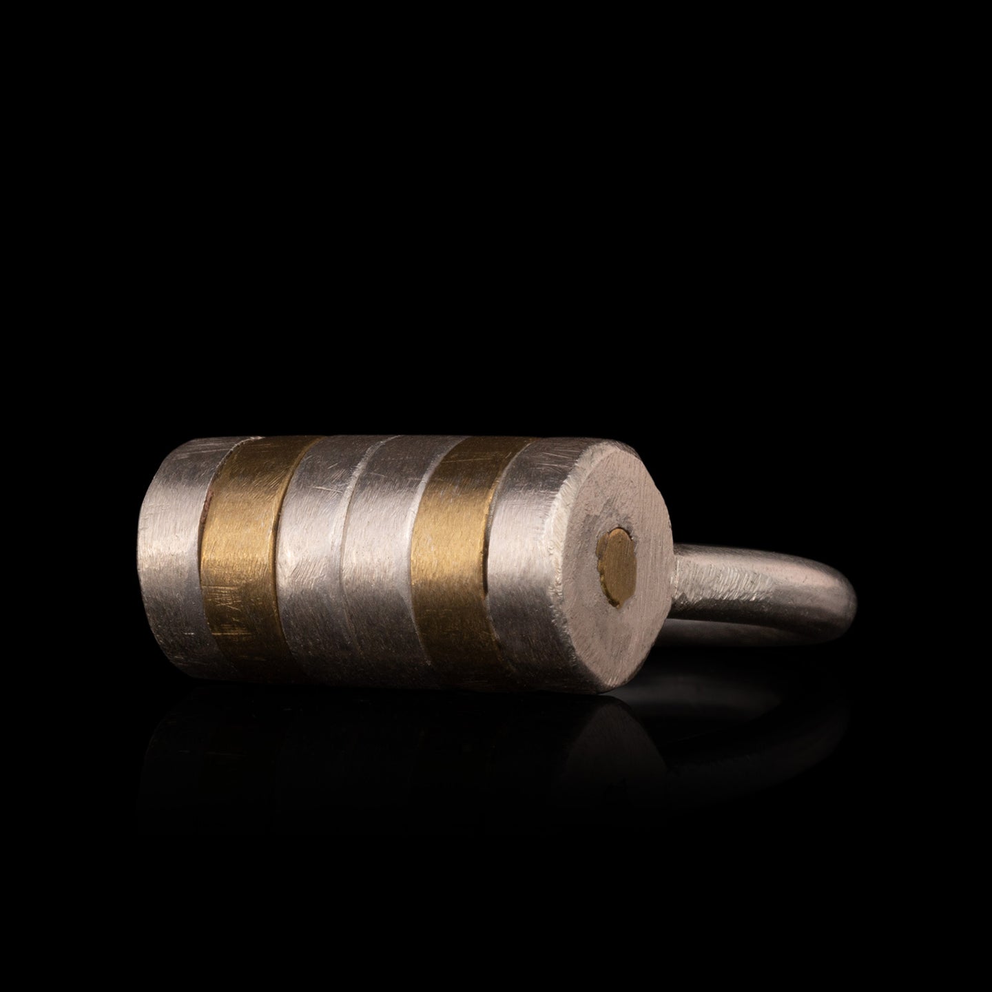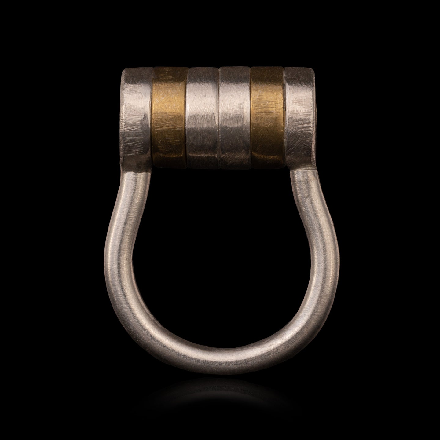 We love how hefty this one of a kind silver and brass ring is. It looks great as a statement piece on the finger, or worn on a chunky silver or gold chain.
