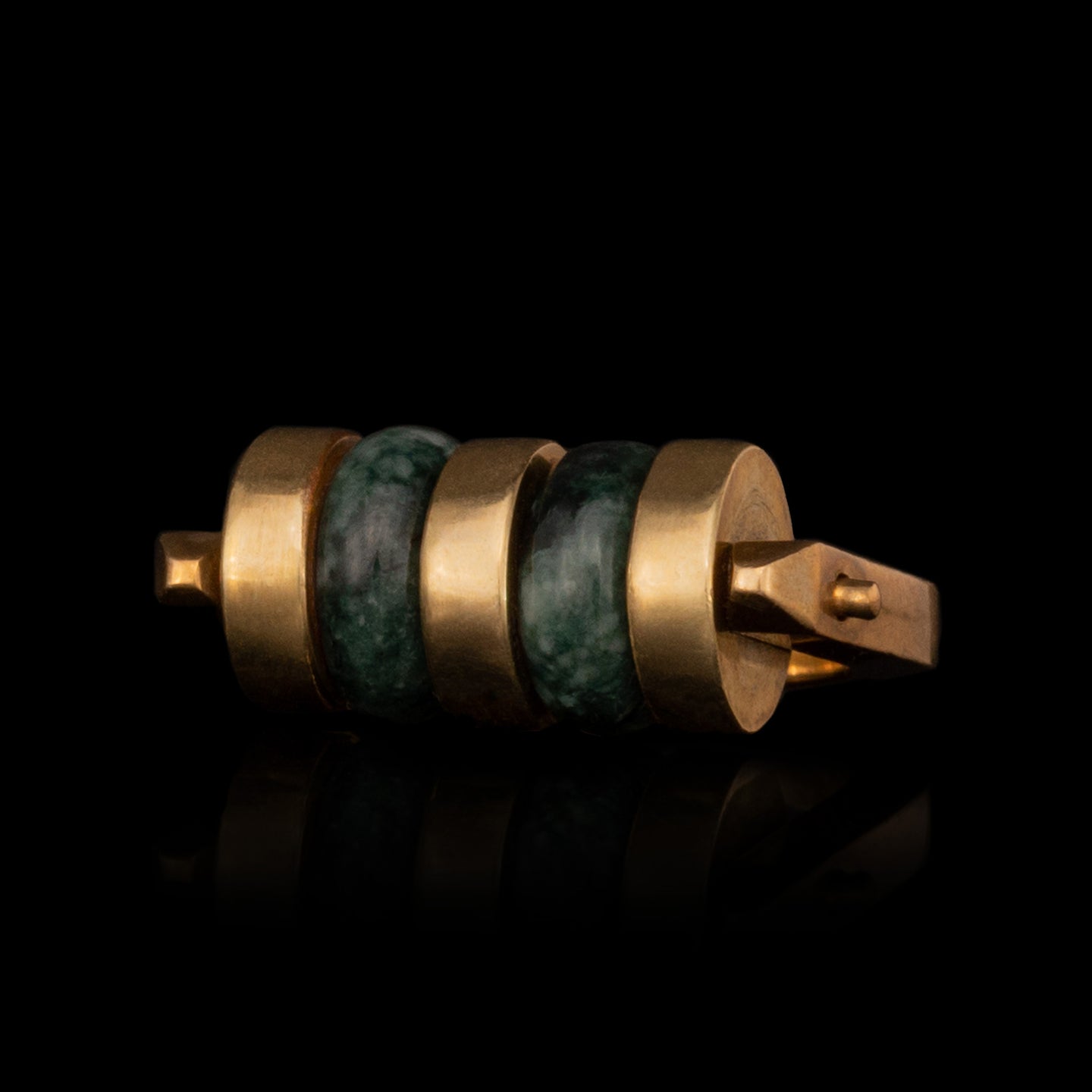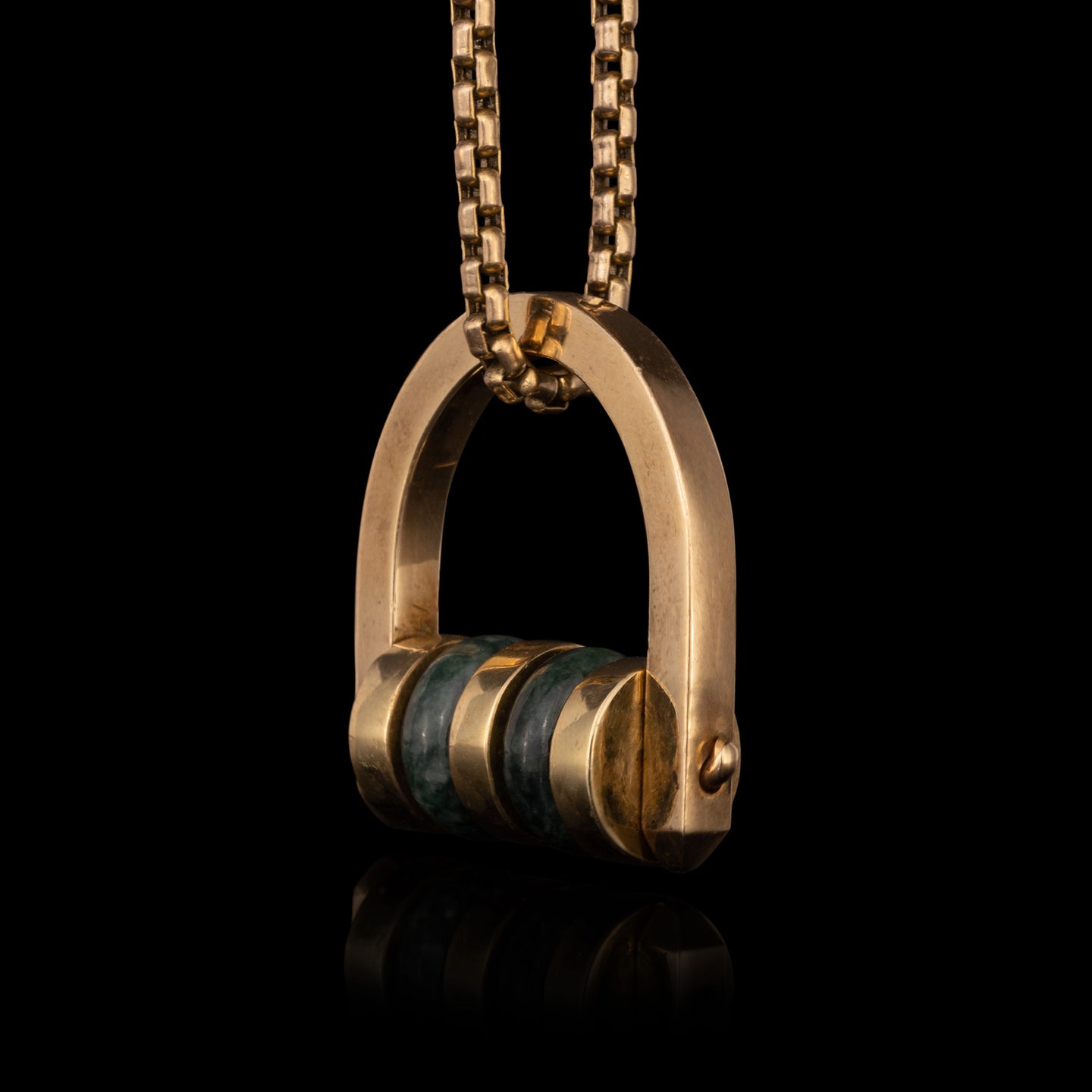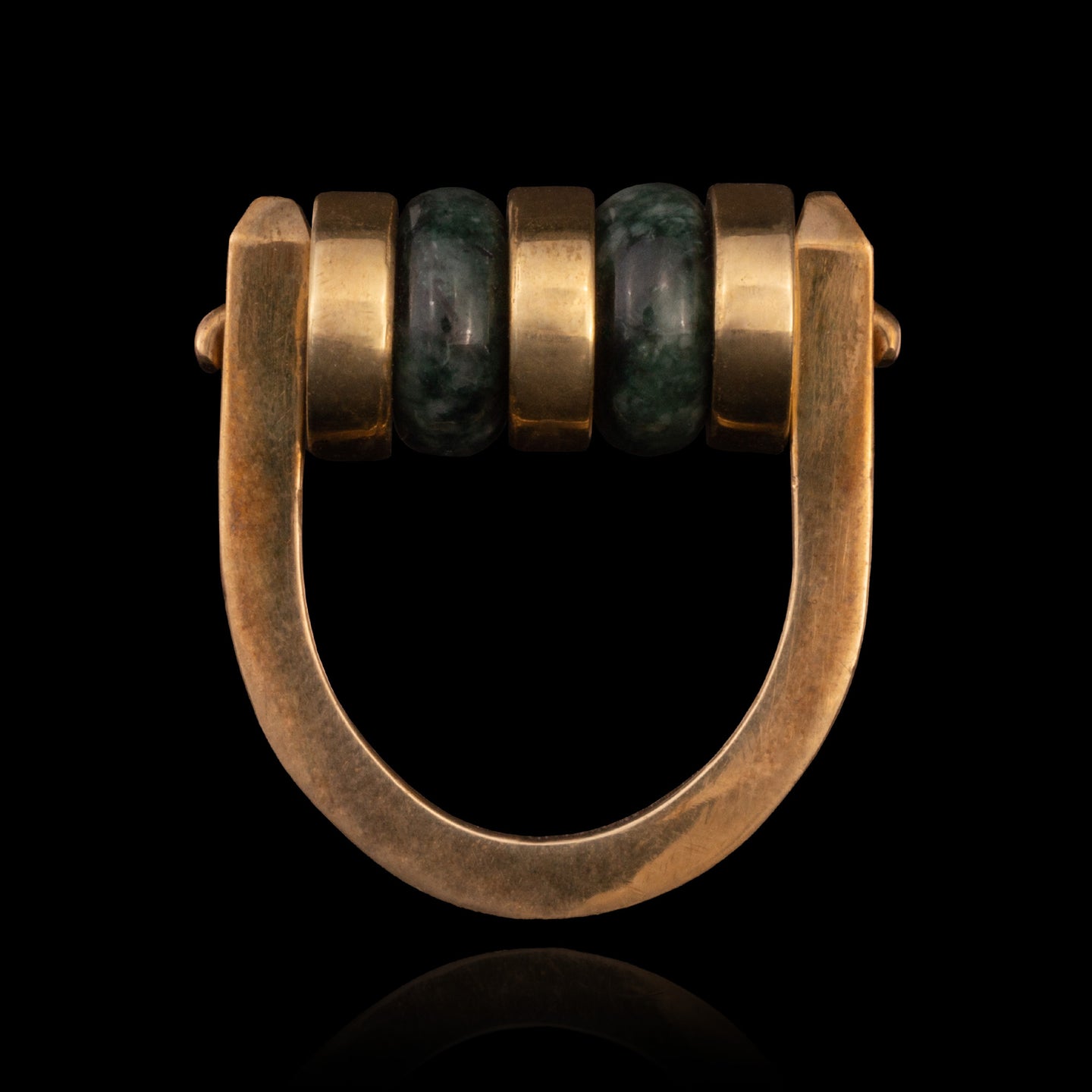 Jungle green Guatemalan jadeite and brass. We didn't have Cleopatra in mind when we designed this one but once we finished it, we thought maybe she'd have worn it. This also looks great strung on a long beefy chain.