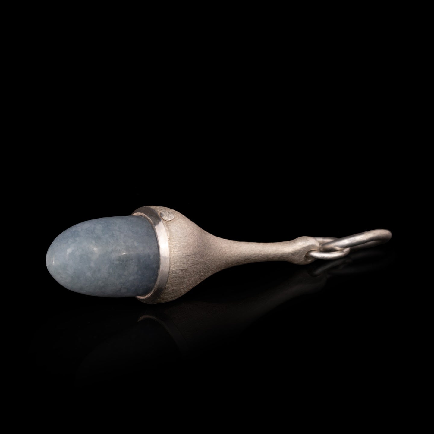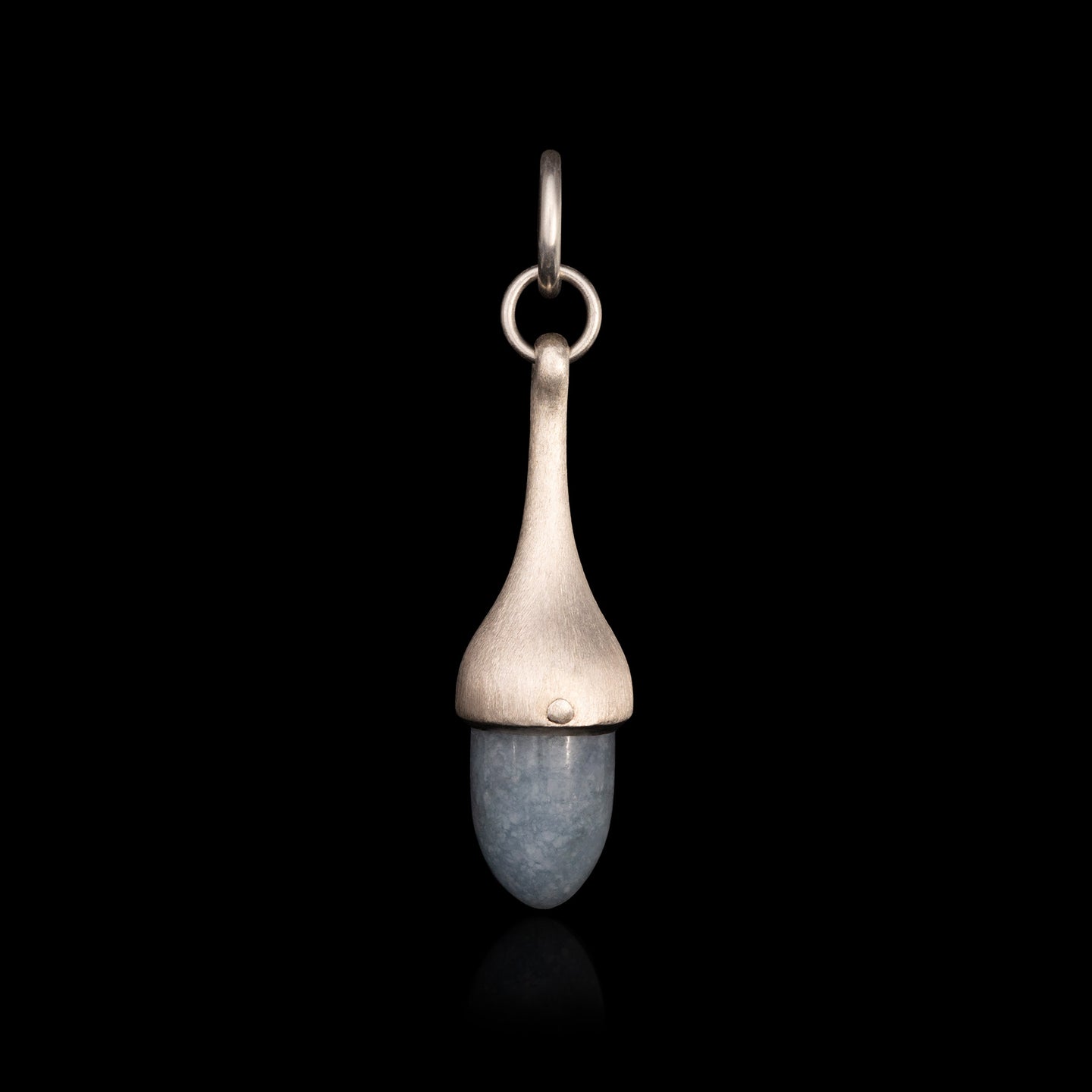 One of a kind Sky Blue Guatemalan jadeite bullet set in 925 Silver. Kind of like an acorn? Kind of like a teardrop? Either way, it's got curves. We think the colour of this jadeite would go perfectly with your beat-up 501's and a white tee, naturally.